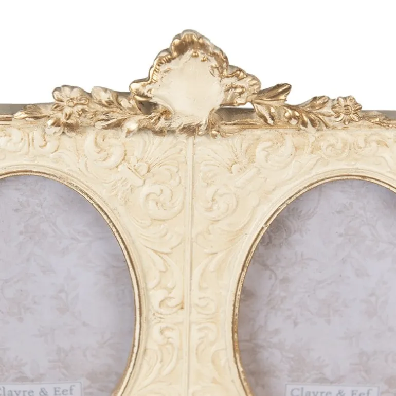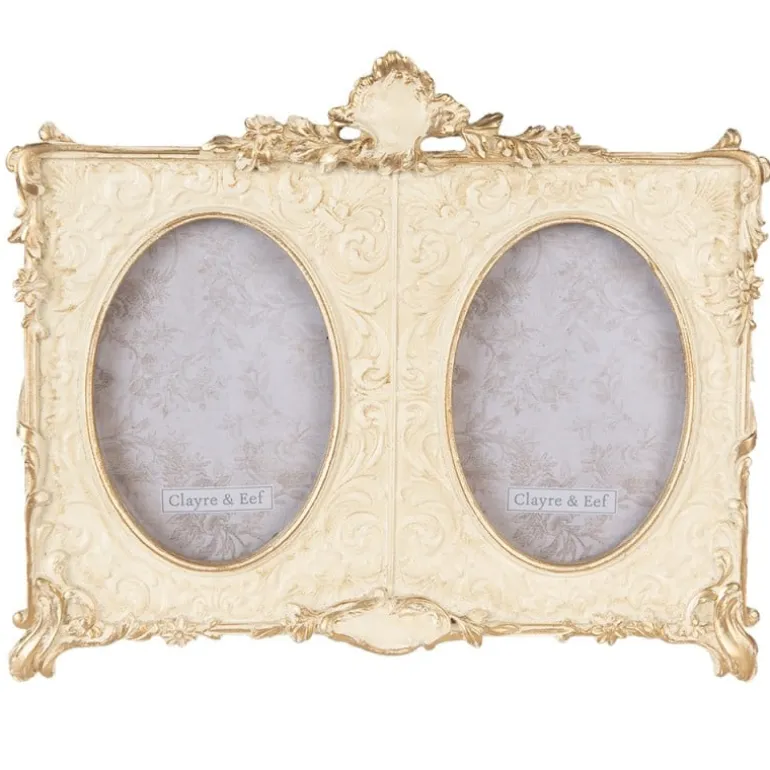 Prachtige sierlijke fotolijst voor 2 ovale foto’s. De fotolijst heeft sierlijke motiefjes, de hoofdkleur is beige en afgewerkt met een beetje goudkleur! Op de rand bevinden zich enkele kleine bloemetjes.