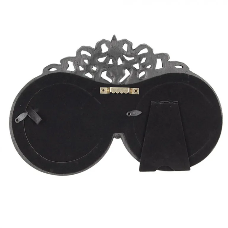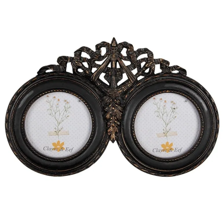Prachtige duo fotolijst voor 2 ronde foto’s. De fotolijst heeft een zwarte kleur en aan de bovenkant bevind zich een ornament. Afgewerkt met een klein beetje bronskleur.