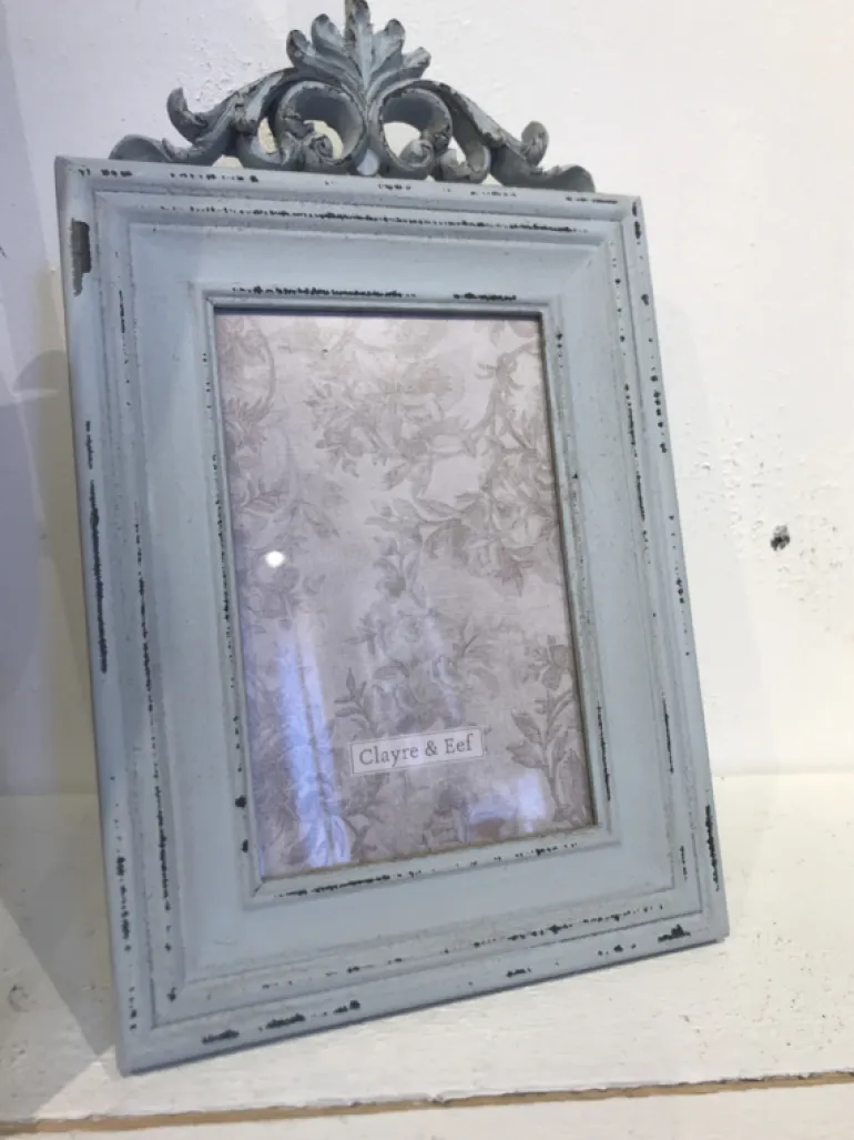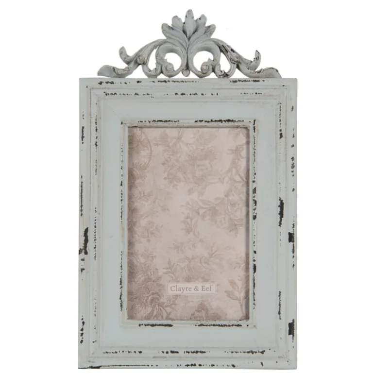 Mooie fotolijst met een brocante uitstraling, aan de bovenkant vind je een leuk mornament.