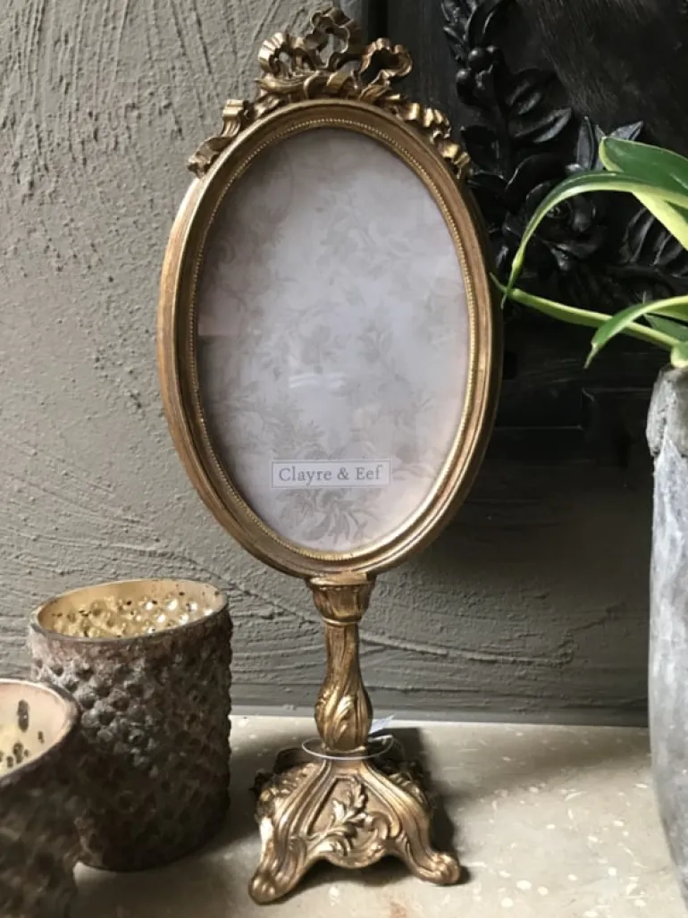 Mooie fotolijst op een prachtig bewerkte voet en aan de bovenkant een strik.