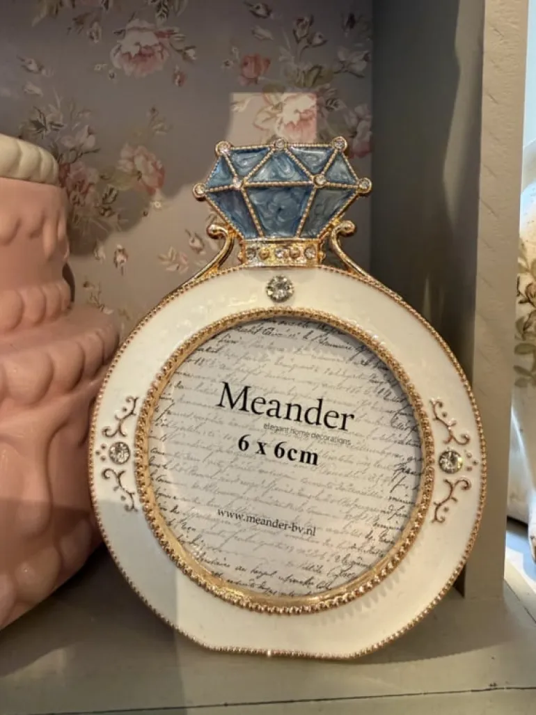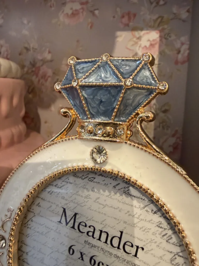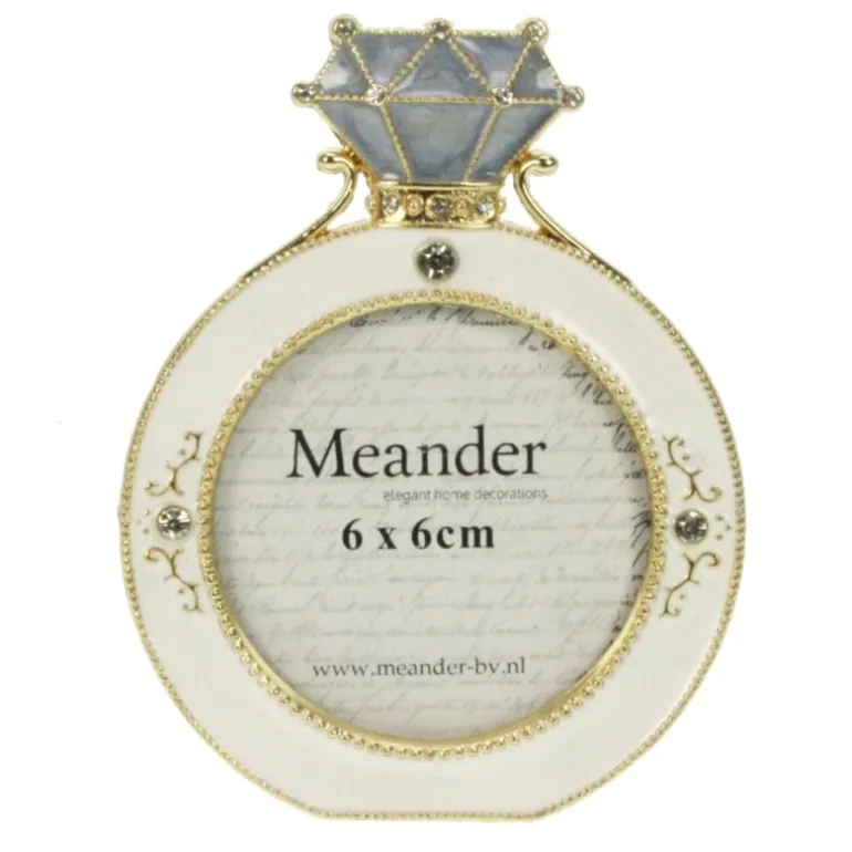 Een prachtig fotolijstje in de vorm van een ring!Het ijzeren fotolijstje is wit van kleur met een grijs/blauwe “diamant”. Het fotolijstje is afgewerkt met goudkleurige versieringen en strasssteentjes.