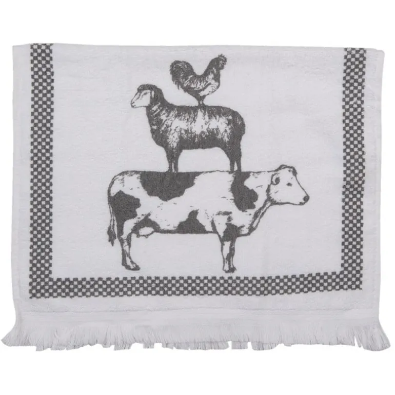 Landelijk gastendoekje met een afbeelding van een koe met daarop een schaap en daarop een kip met daar omheen een geruite rand!