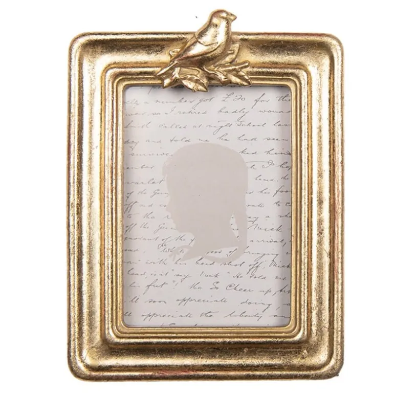 Mooi goudkleurig fotolijstje voor een kleine foto in een rechthoekige vorm. Aan de bovenkant vind je een vogeltje.