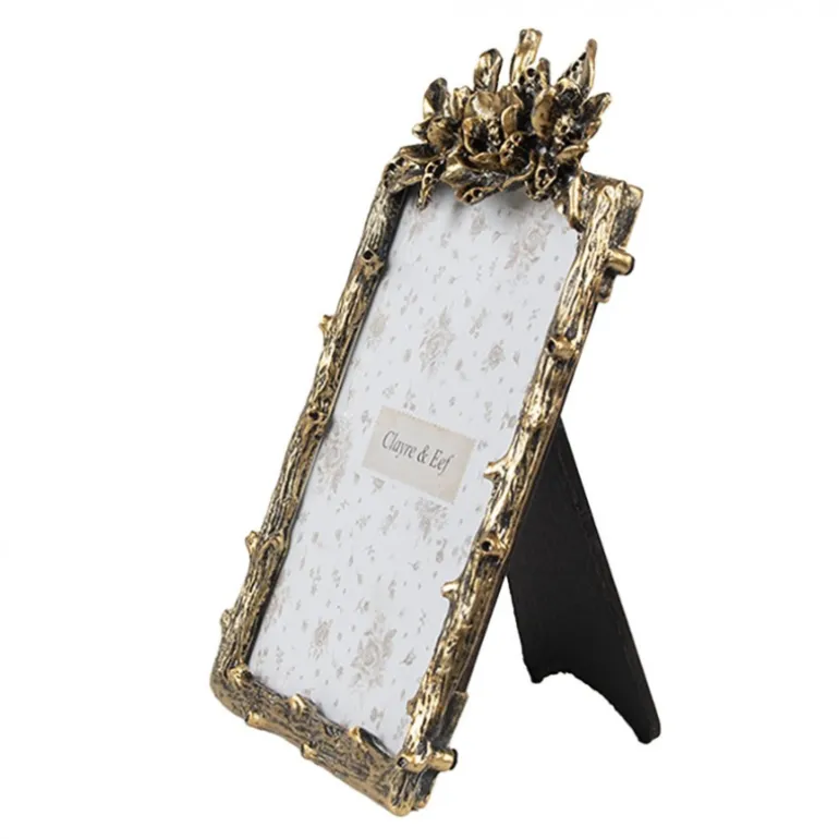 Mooie en aparte goudkleurige fotolijst met boven aan de rand bloemen en de rand heeft een tak- motief