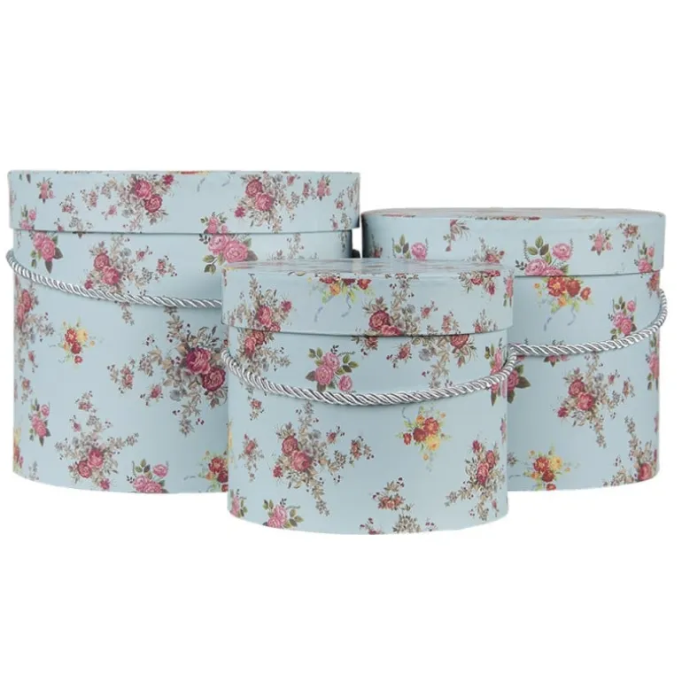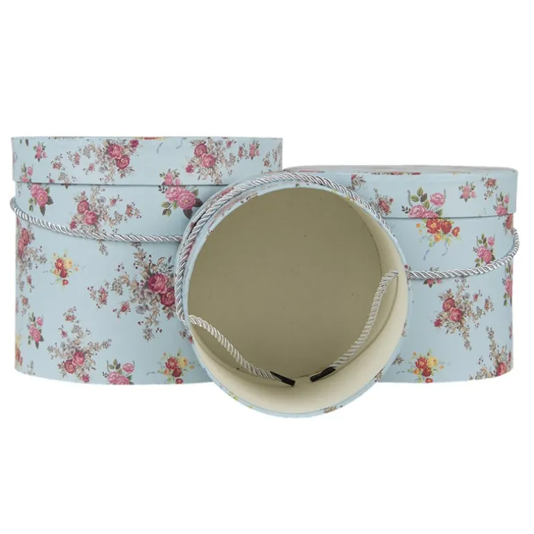 Berg je spullen op in deze mooie set van 3 hoedendozen. Natuurlijk staan deze hoedendozen ook zeer decoratief in of op een kast! De hoedendozen hebben een mooie rozenprint op een blauwe achtergrond en zijn voorzien van een koord.