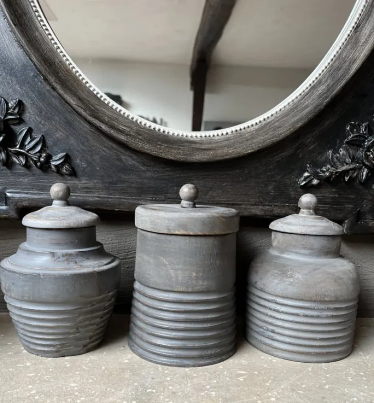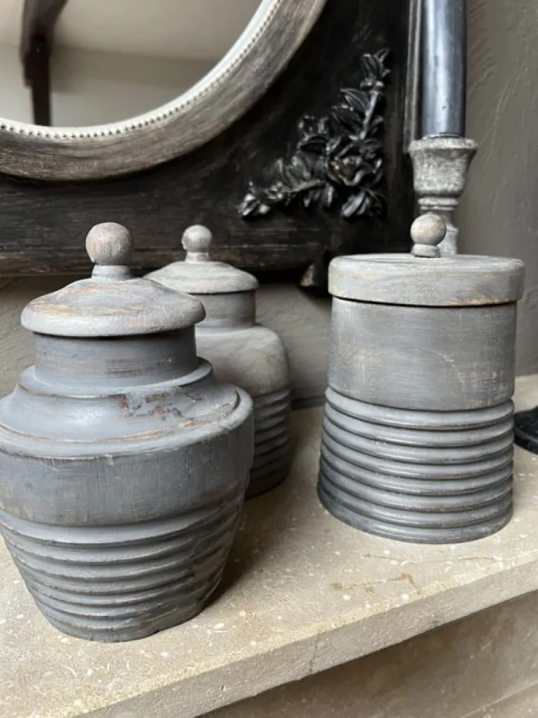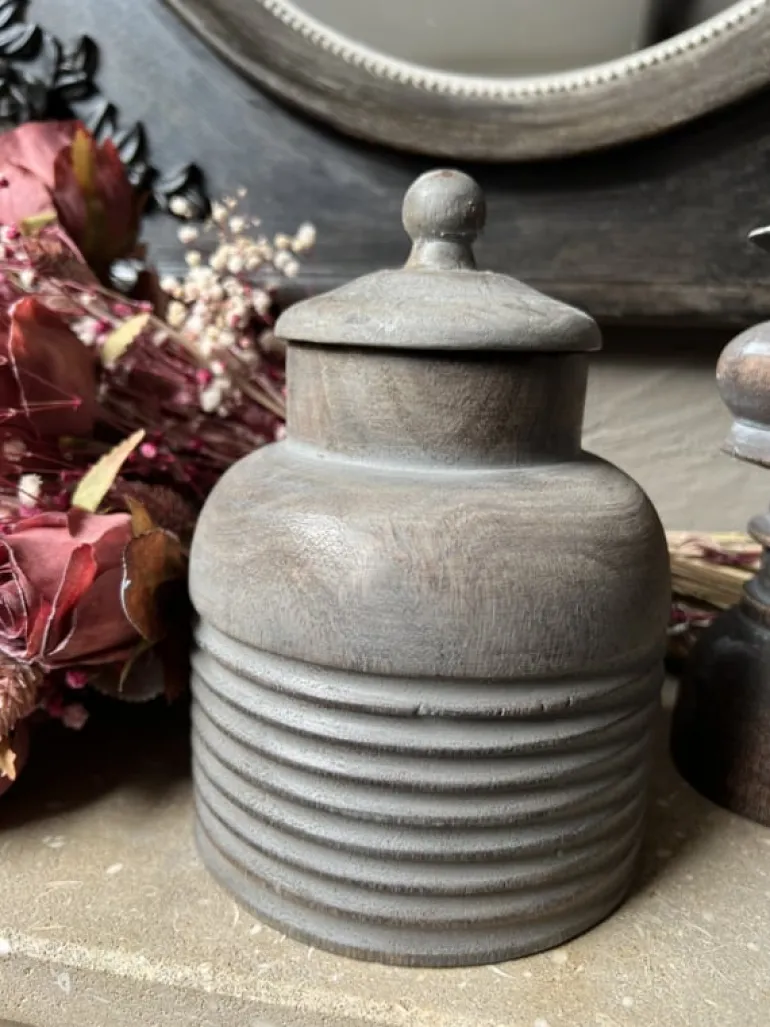 Prachtige houten decoratie pot voor in een stoer landelijk interieur. De decoratie potheeft een afneembaar deksel is puur voor decoratie en niet geschikt om etenswaren in te bewaren.