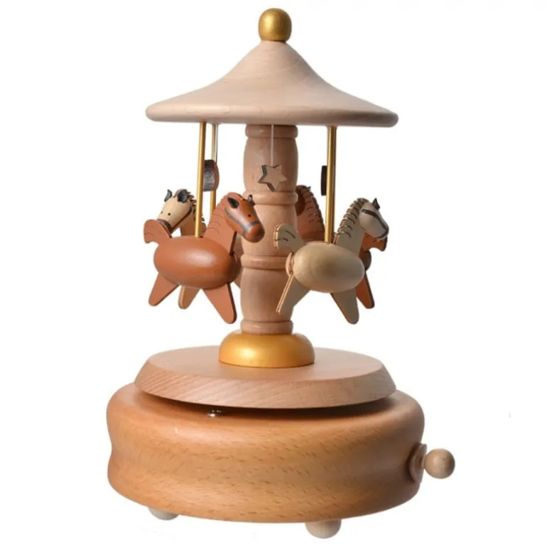 Een mooie houten muziekdoos met een rustgevend muziekje. De muziekdoos is in houtkleur en is voorzien van schattige paardjes. Je zet de muziekdoos aan door aan het bovenste gedeelte te draaien. Met het knopje aan de zijkant kan het weer uit of aan gezetworden.
