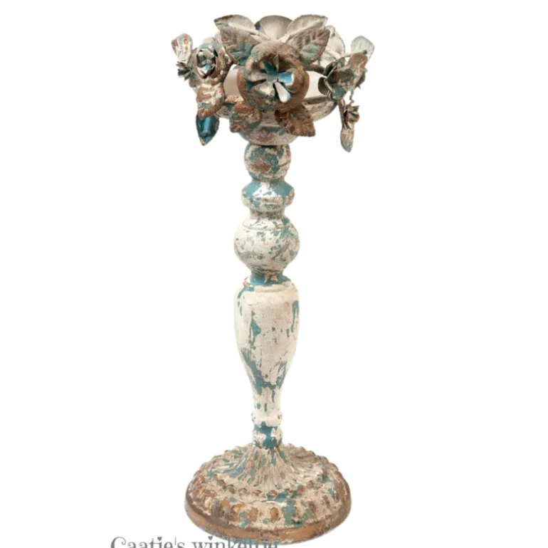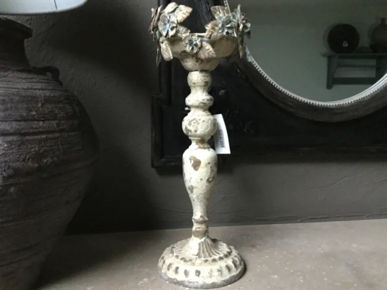 Echt een plaatje deze ijzeren kandelaar met boven aan de rand ijzeren bloemen. De kandelaar isoud gemaakt en heeft daardoor een brocante uitstraling. Super om te combineren met andere kandelaars!