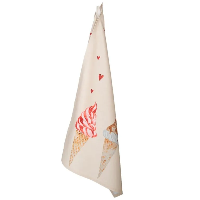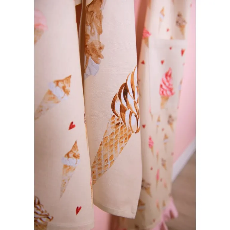 Zoeter dan zoet! Een vrolijke eng schattige textielserie met een patroon van ijsjes en rode hartjes. De perfecte ingrediënten die deze serie zo snoezig maakt. De roze accenten en de beige achtergrond zijn de perfecte basis voor de prachtige illustraties. Maak de tafelmomenten extra feestelijk met deze tafellopers, keukendoeken, ovenhandschoenen, pannenlappen, papieren servettenen broodmandjes. Er is zelfs een kindercollectie beschikbaar van deze serie. Een heerlijk ijs is altijd een goed idee!
