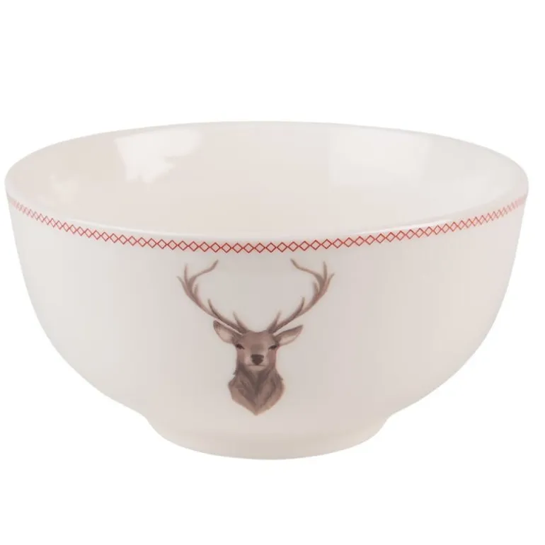 Ook zeergeschikt voor de kerstdagen dit mooie porseleinen servies met een print van een hertenkop met prachtig gewei! De kleur is beige met een bruine hertenkop en als afwerking vind je een klein schuin ruitje in het rood.