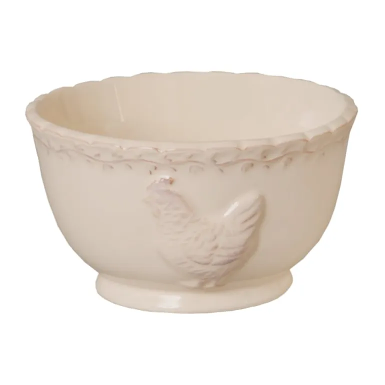 Door de cremekleur is dit landelijk servies met kip met heel veel te combineren! Het servies heeft een leuke kip en een bewerkte rand en krijgt daardoor een brocante uitstraling