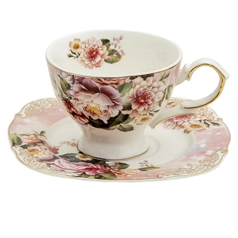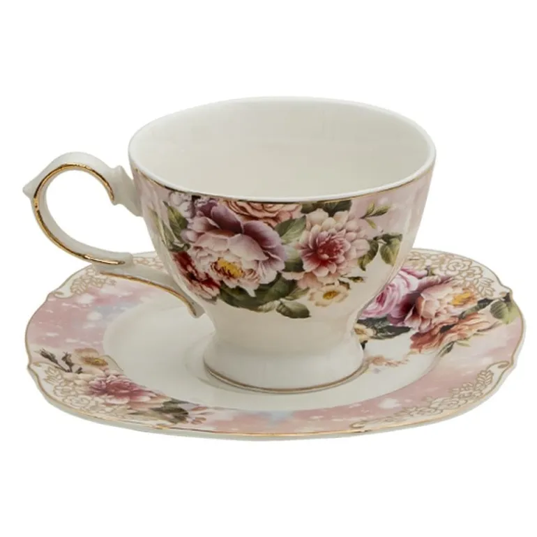 Prachtige klassiek porseleinen kop en schotel met een bloemen/rozenprint, een mooi bewerkt bordje en goudkleurige accenten.