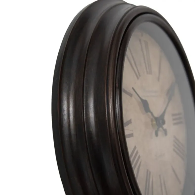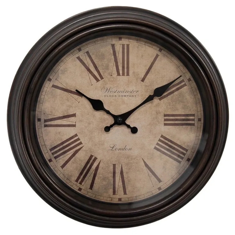 Landelijke klok met een beige/bruine achtergond, romeinse cijfers en bruine rand. De tekst op de klok is”Westminster clock company London”