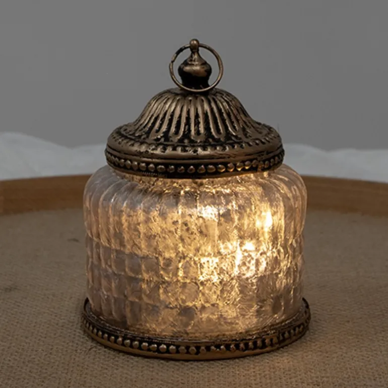 Gemaakt van glas en ijzer, de deksel zit vast. De LED-verlichting creëert een warme gezellige sfeer!