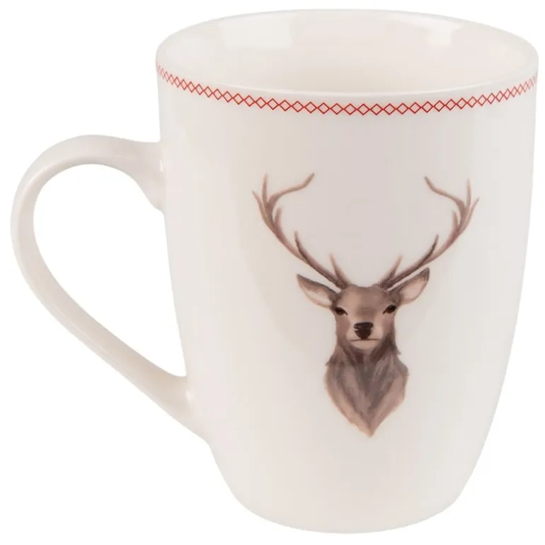 Ook zeergeschikt voor de kerstdagen dit mooie porseleinen servies met een print van een hertenkop met prachtig gewei! De kleur is beige met een bruine hertenkop en als afwerking vind je een klein schuin ruitje in het rood.