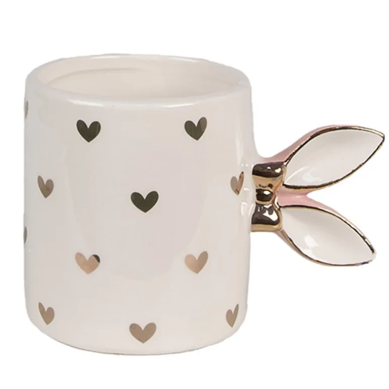 Prachtige mok met aan de zijkant 2 schattige konijnen oren. De witte mok is voorzien van goudkleurige hartjes en heeft 2 konijnen oren met een goudkleurig strikje.