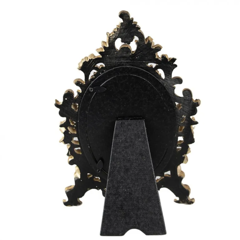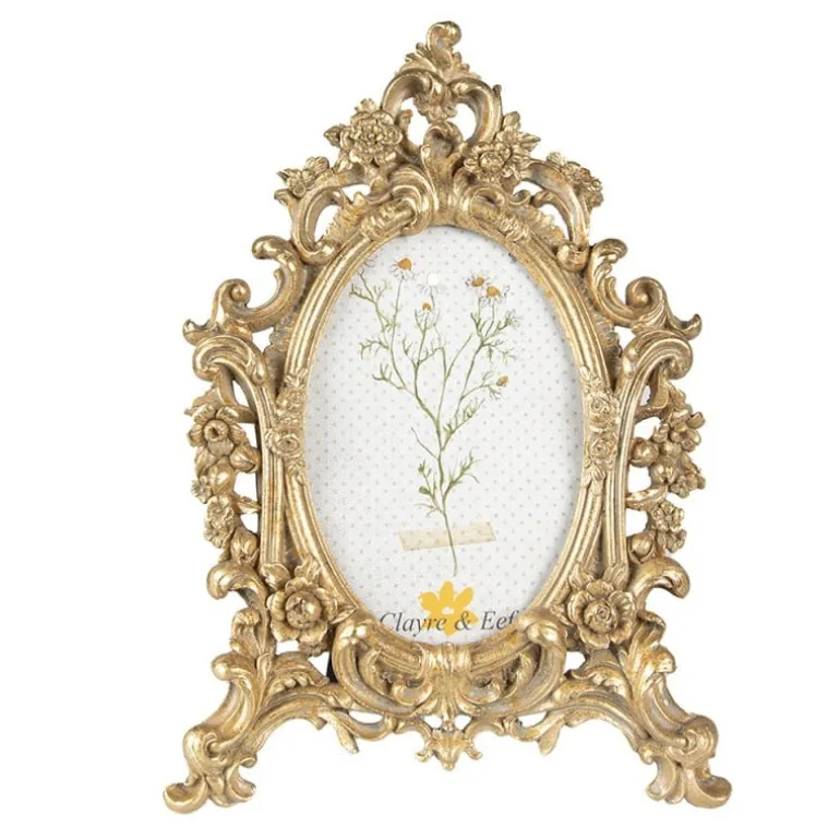 Decoratieve goudkleurige fotolijst, in een klassieke stijl met een romantische uitstraling. De fotolijst staat op “pootjes” en heeft een prachtige rand van bloemen en blader motiefjes.