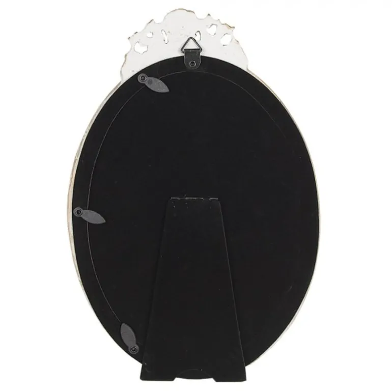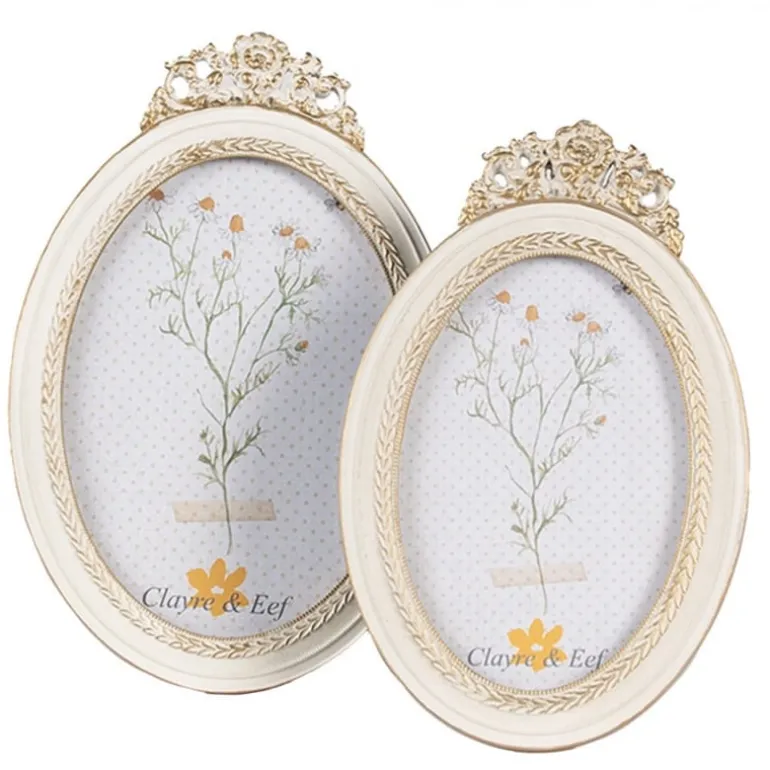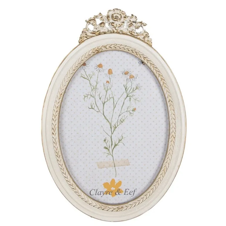 Mooie ovale fotolijst in een beige kleur en is afgewerkt met een mat gouden tint. Aan de bovenkant vind je een mooi ornament enrondom het glas bevinden zich kleine blaadjes.