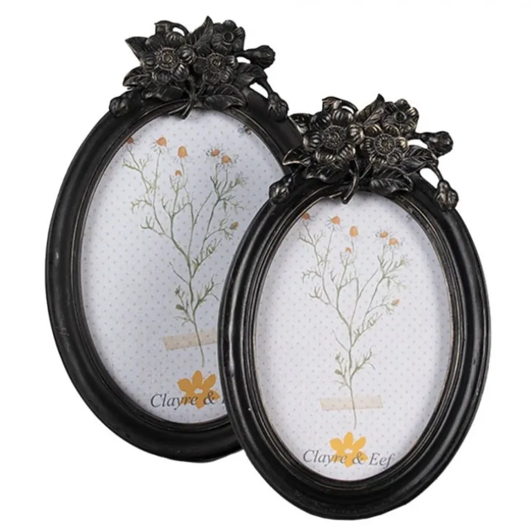 Prachtige ovale fotolijst met een mat zwarte kleur, aan de bovenkant bevind zich een ornament met bloemen afgewerkt met een beetje zilverkleur.