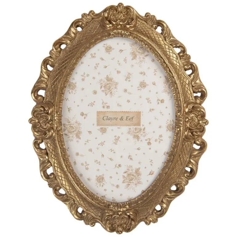 Prachtige sierlijke fotolijst in een ovale vorm.De goudkleurigefotolijst heeft een shabby chic uitstraling met mooie versiersels opde rand en op de rand.