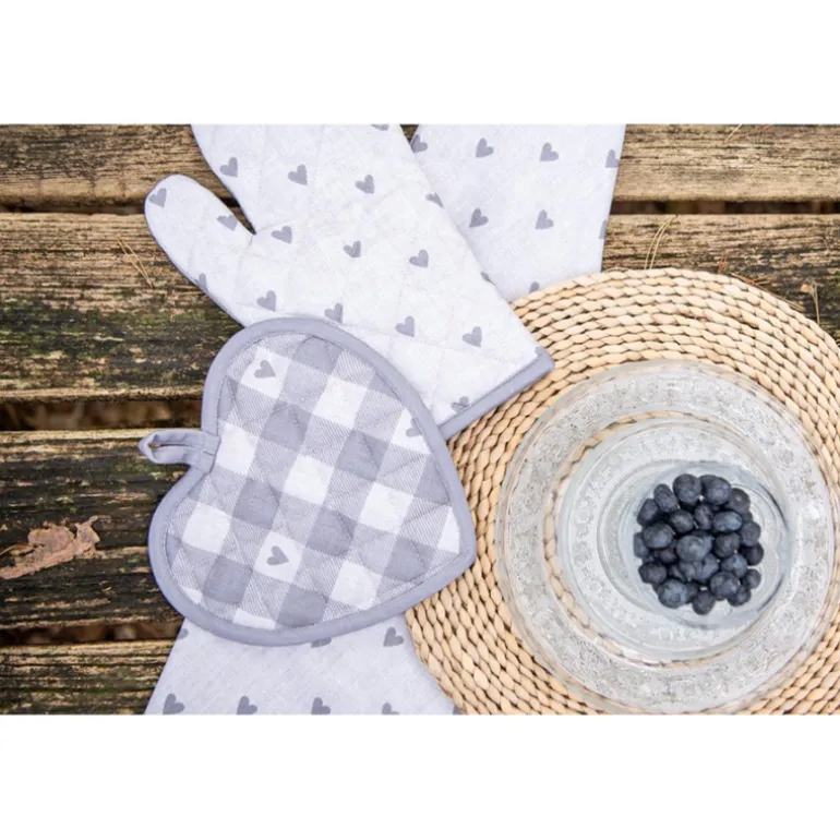 Gemaakt van een katoenen stof met een landelijke ruit gecombineerd met lieflijke hartjes. De serie is verkrijgbaar in de kleuren rood/wit en beige/grijs.
