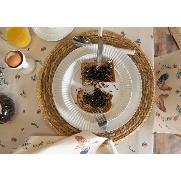 De beige katoenen stof van dit tafelkleed heeft een gezelligeprint van kleine bloemetjes en een kip en haan. Super leuke textielserie voorin de keuken of eetkamer!