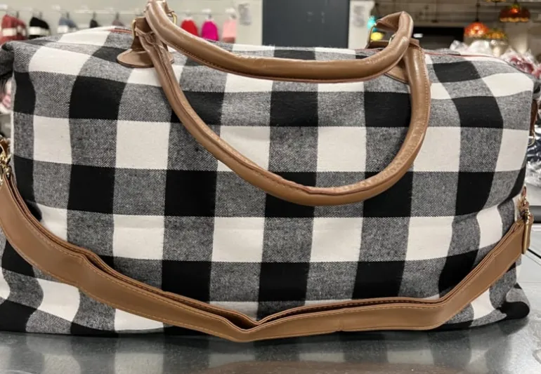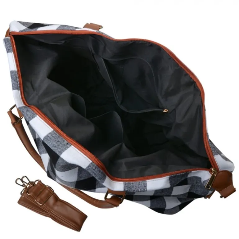 Leuke ruime zwart met witgeruite handige duffle tas, ideaal voor op reis of een weekendje weg. Handig om met de hand te dragen of met de extra draagriemover de schouder. De tas is zwart gevoerd en heeft 1 zak met rits en 2 steekzakjes aan de binnenkant zodatalles zijn eigen plek krijgt.