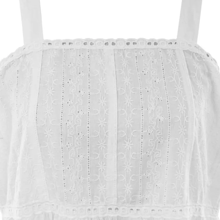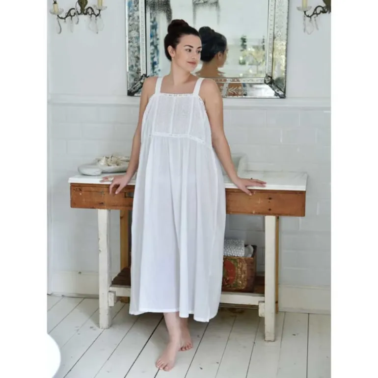 Eenvoudig maar mooiwit nachthemd met bandjes en een rok van zacht, lichtgewicht katoen, perfect voor warmere nachten of voor degenen die de voorkeur geven aan een stijl zonder mouwen. Het lijfje is gemaakt van strokenvan broderie anglaise katoen en afgewerkt met veterranden langs de bovenkant en onder de buste en er is een korte elastische band onder de armen voor comfort en een goede pasvorm.