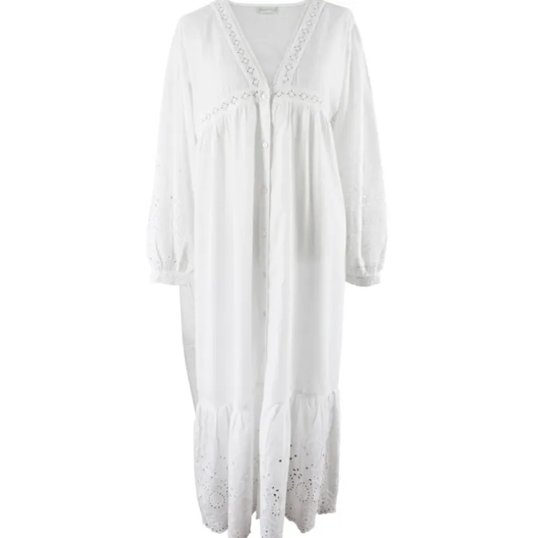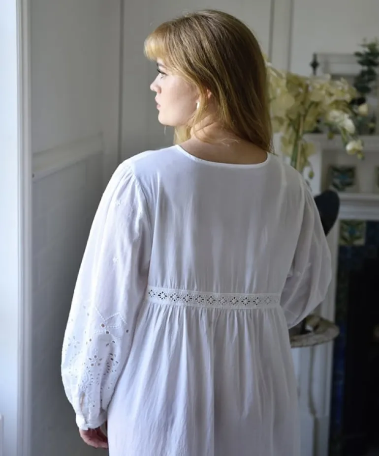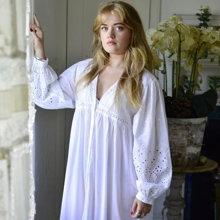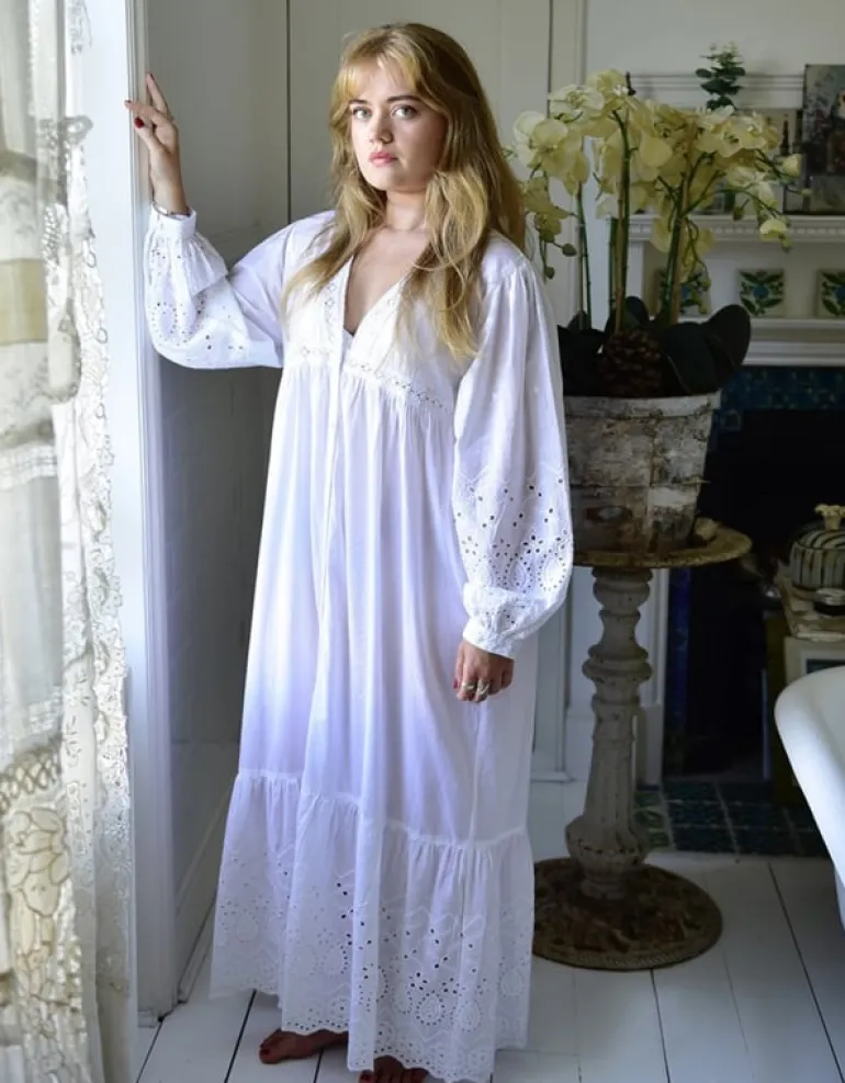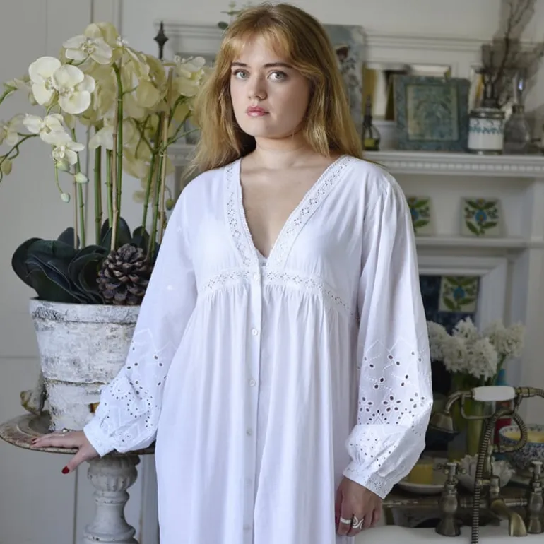 De ‘Clarissa’ is een prachtig nachthemd met knoopjes dat tot aan de enkels valt en lange mouwen heeft die met een knoopje gesloten kunnen worden. Dit prachtige nachthemd met lage V-hals heeft een overvloed aan mooie details: geborduurde katoenen kanten biezen op de borst en rond de buste, geborduurde mouwen en een volledig geborduurde, diepe volantzoom. Deze stijl is ruim en comfortabel. Hij kan in de zomer ook als een prachtige jurk gedragen worden.