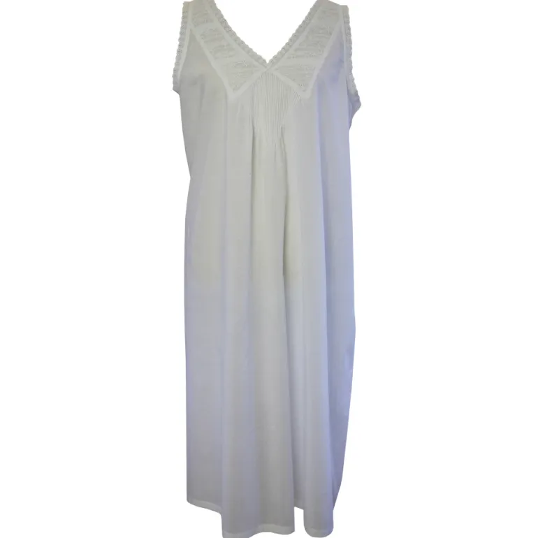 Jane is een mooi mouwloos katoenen nachthemd met prachtig borduurwerk en sierlijke plooitjes. Jane is een elegant en nonchalant nachthemd dat teruggrijpt naar de stijl van de jaren 30. Dit model is mouwloos en valt onder de knie.