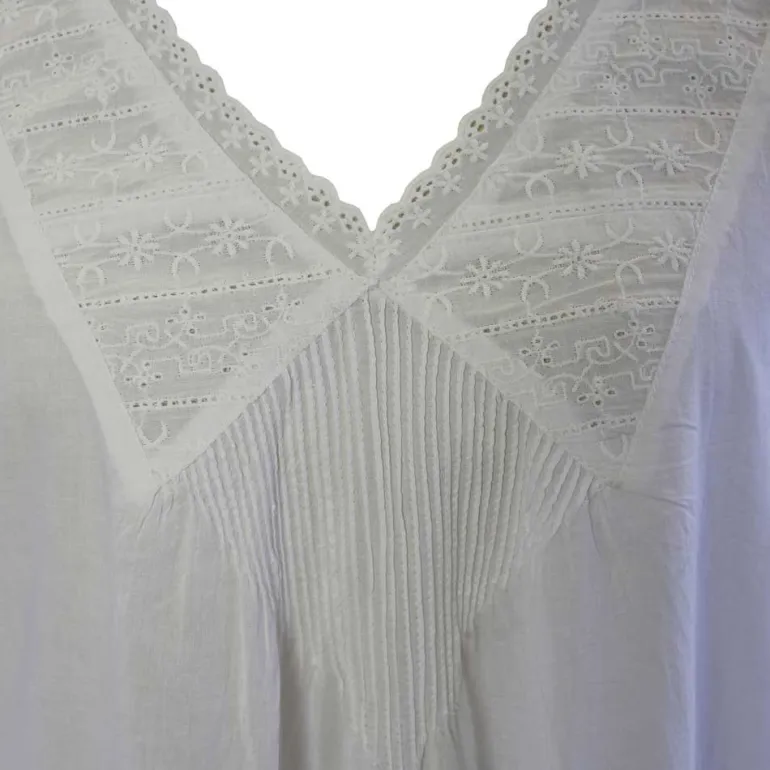 De V-vormige halslijn en mouwen zijn afgezet met smalle broderie anglaise. Onder de halslijn bevinden zich puntige kraagvormige pandjes met wit borduurwerk en zeer fijne plooitjes die zorgen voor die perfecte vintage look.