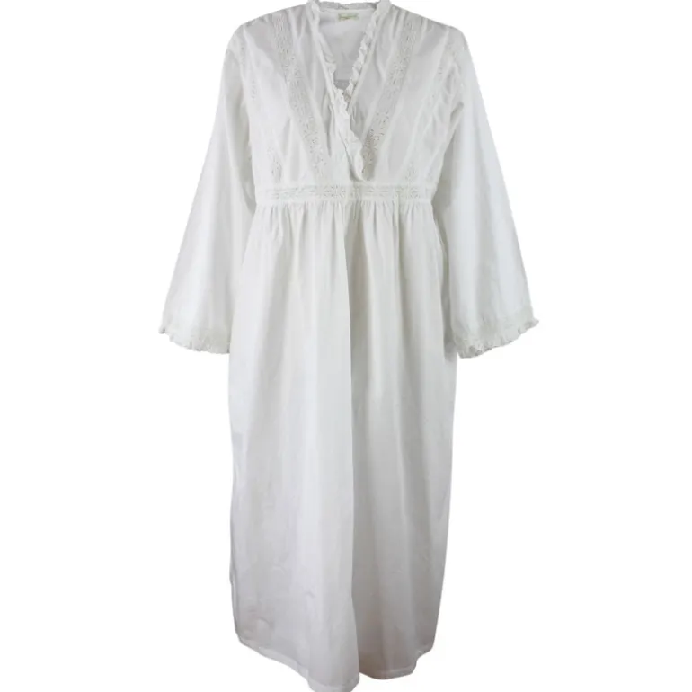 Het prachtige nachthemd ‘Tabitha’ heeft een prachtige klassieke look met lange mouwen en mooie kanten boorden langs de manchetten. Dit lange nachthemd van wit katoen heeft een geplooide V-hals, rijen borduursels van de schouders tot de buste en de kanten versiering ook onder de buste.