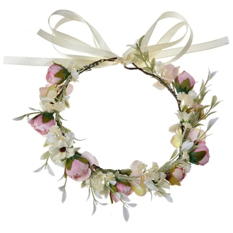 Prachtige haarband met een romantische uitstraling. De haarband is voorzien van witte bloemetjes, roze roosjes en takjes. Met een crèmekleurig lint.