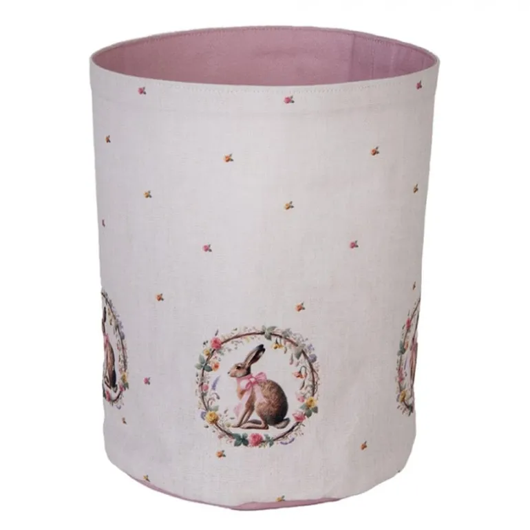 De textielserie is gemaakt van katoenen stof met eenbeige ondergrond en een design van een mooie krans met daarin een haas met een rozestrik. De krans heeft allemaal bloemetjes, roosjes en blaadjes. Verspreid over de stof vind je ook kleine roosjes en blaadjes. De meeste items van deze serie zijn afgewerkt met een rozeband.