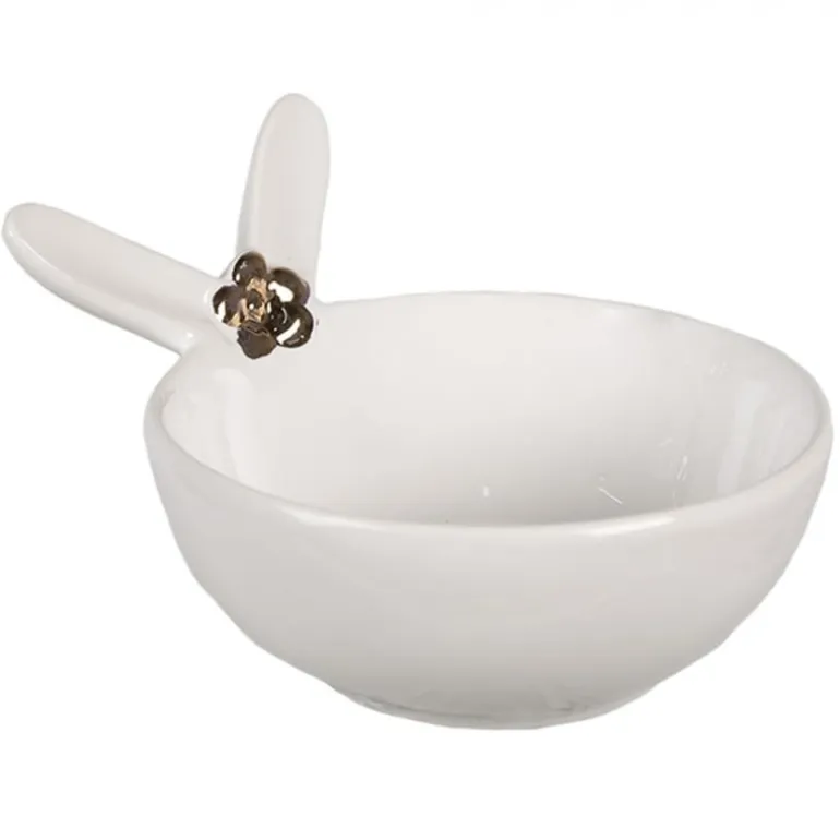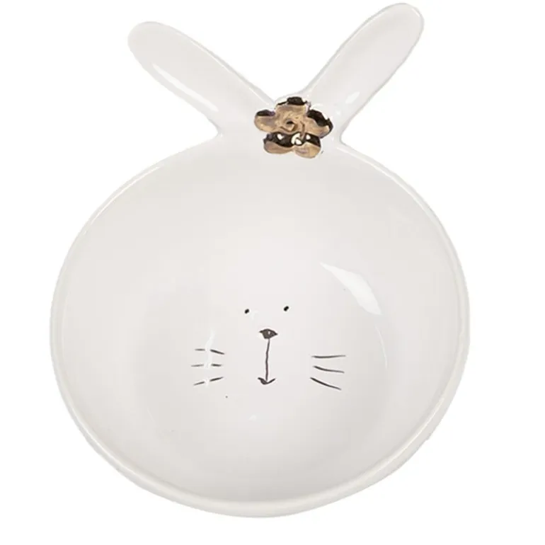 Leuk schaaltje of serveer kom om bv paaseitjes in te doen. Het schaaltje is voorzien van konijnen oren met een goudkleurig bloemetje in het schaaltje vind je een goudkleurig konijnen snoetje