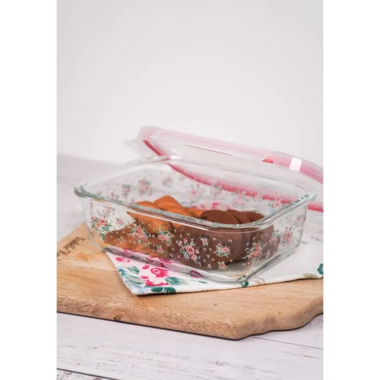 Mooie set van 2 glazen schalen met siliconen klik en sluitdeksel. 1 deksel met de kleur roze en 1 deksel met de kleur groen. De glazen kommen hebben een gezellig roosjes design.