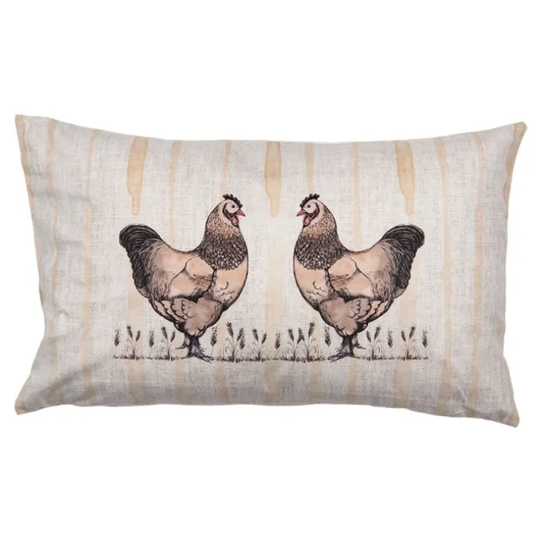 Mooie sierkussenhoesmet een stel prachtige kippen op een beige gestreepte achtergrond. Leuk als je van kippen houdt of voor in een landelijk interieur!