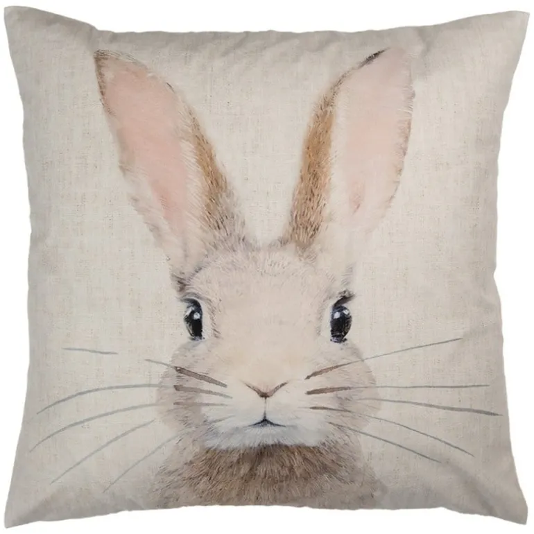 Prachtige sierkussenhoesmet een lieflijk konijn op een linnenlook achtergrond. De kussenhoes is aan beide zijde hetzelfde.
