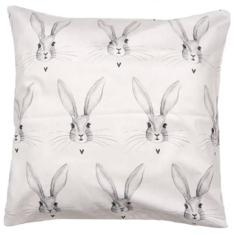Prachtige sierkussenhoesmet een lieflijk konijn op een linnenlook achtergrond, ook vind je onder het konijn een zwart hartje. De achterkant van de kussenhoes heeft dezelfde print maar dan met kleinere konijntjes en hartjes.