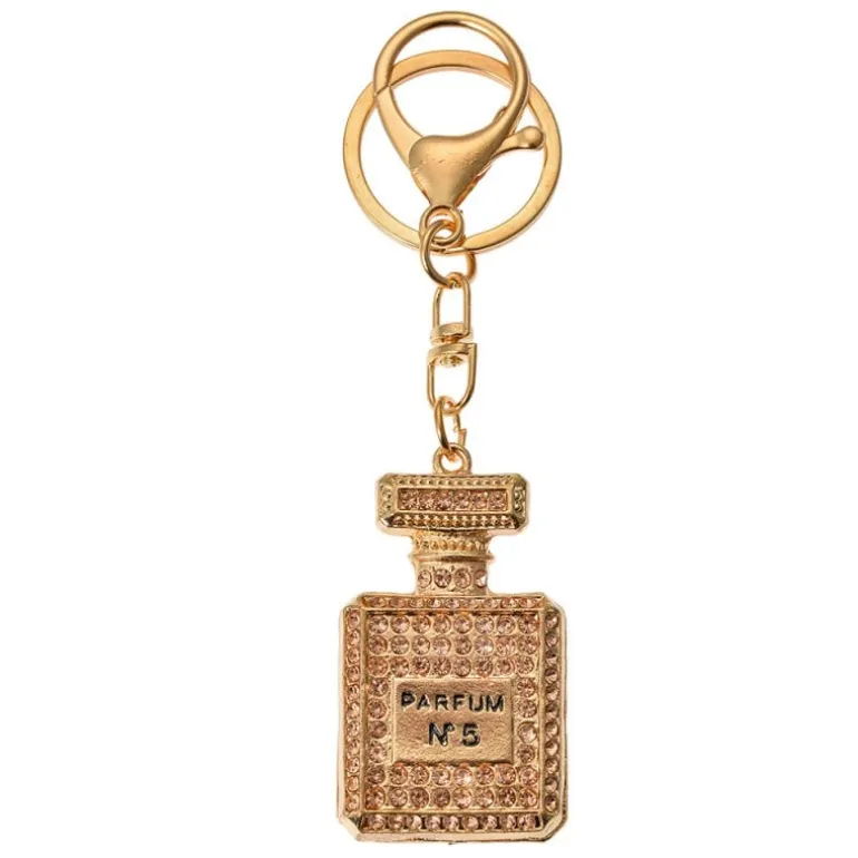 De mooie hanger heeft de vorm van een parfumfles, bezet met allemaal kleine steentjes. De hanger zelf is goudkleurig.