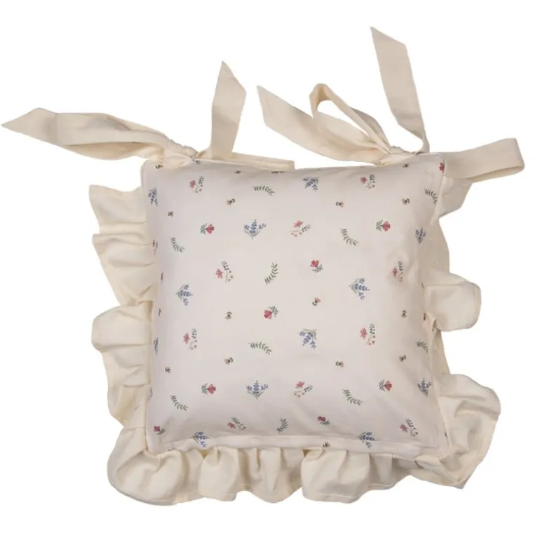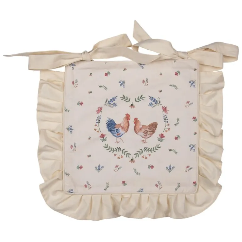 De beige katoenen stof van deze stoelkussenhoesheeft een gezelligeprint van kleine bloemetjes en een kip en haan. Super leuke textielserie voorin de landelijke keuken of eetkamer!