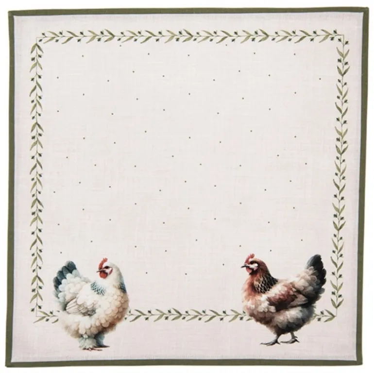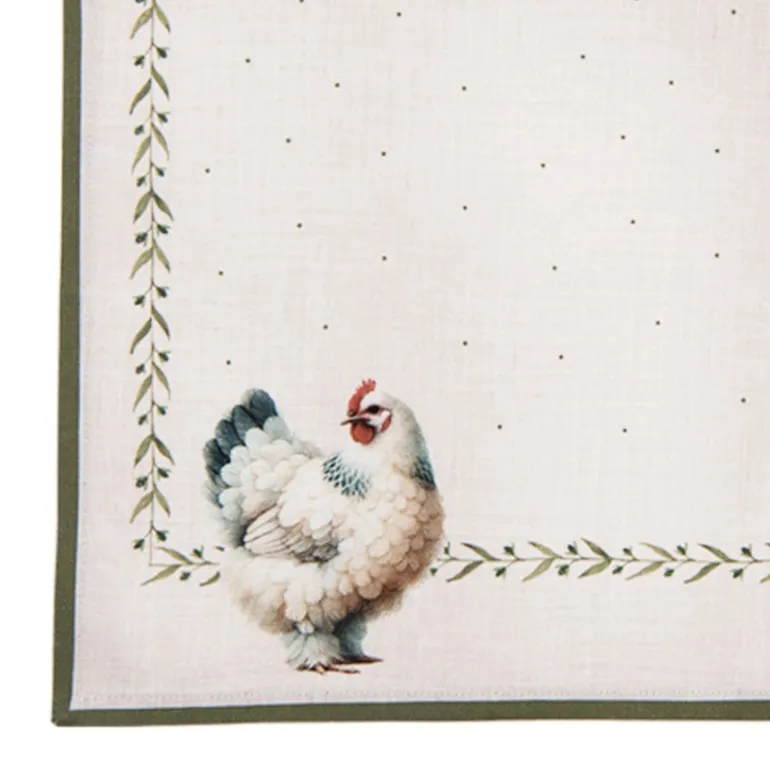 De textielserie Barnyard Chicken van Clayre & Eef is gemaakt van een mooie katoenen stof met beige ondergrond en met een print van heuse boerderij kippen! Ook vind je er een versiering van kleine blaadjes en groene stipjes. Het geheel is afgewerkt met een groene band. Kortom een gezellige serie voor een landelijk interieur!