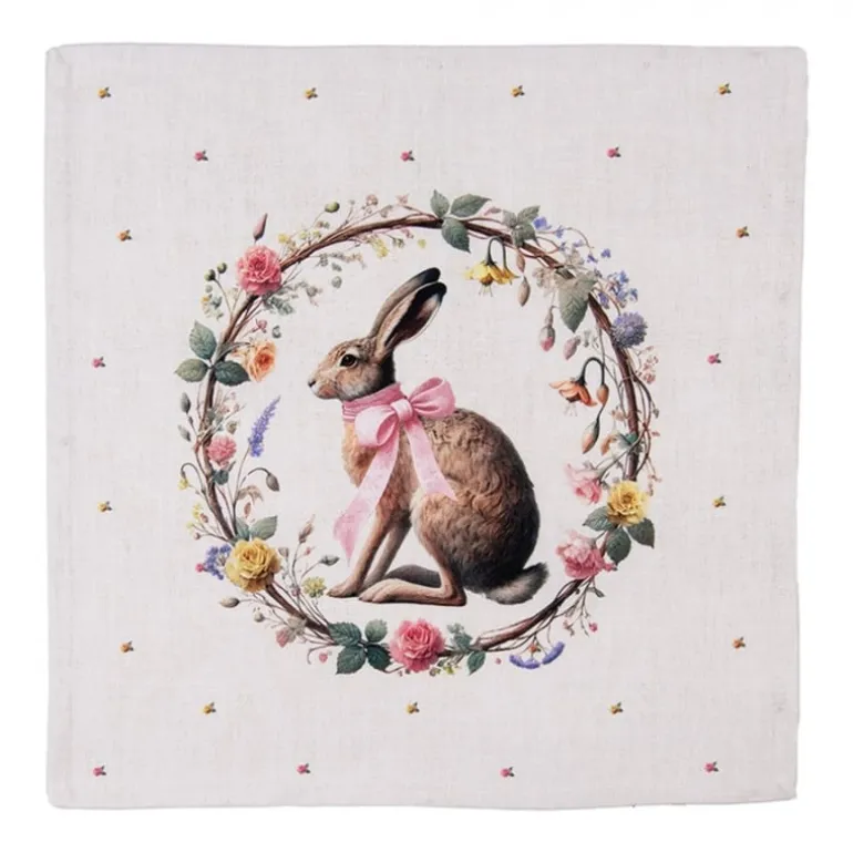 De textielserie is gemaakt van katoenen stof met eenbeige ondergrond en een design van een mooie krans met daarin een haas met een rozestrik. De krans heeft allemaal bloemetjes, roosjes en blaadjes. Verspreid over de stof vind je ook kleine roosjes en blaadjes. De meeste items van deze serie zijn afgewerkt met een rozeband.