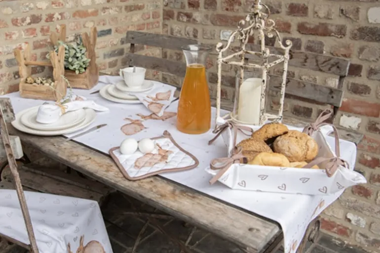 Als we aan Pasen denken, dan denken we aan de paashaas. In deze prachtige textielserieBunnies in Lovevan Clayre & Eef staan twee schattige konijntjes centraal. Een neutrale serie die in elk interieur helemaal tot zijn recht zal komen. Het lieflijke hartjes patroon maakt van dit textiel een schattige serie die niet alleen tijdens de paasdagen veel gezelligheid op tafel en in de keuken zal brengen, maar waar het hele jaar door van genoten kan worden. De keukenschort, ovenhandschoen en pannenlap is ook voor kinderen beschikbaar van deze serie. Met items als een tafelkleed, placemats, servetten en broodmandjeis een liefdevolle gedekte eettafel gegarandeerd.