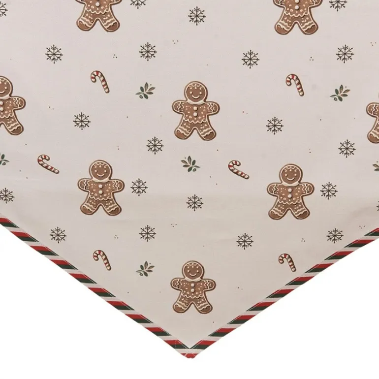 De mooie beige katoenen stof heeft een leuke print van peperkoek mannetjes, zuurstokjes en sneeuwvlokjes. De artikelen zijn afgewerkt met een streepjesstof in de kleuren beige, rood en groen.