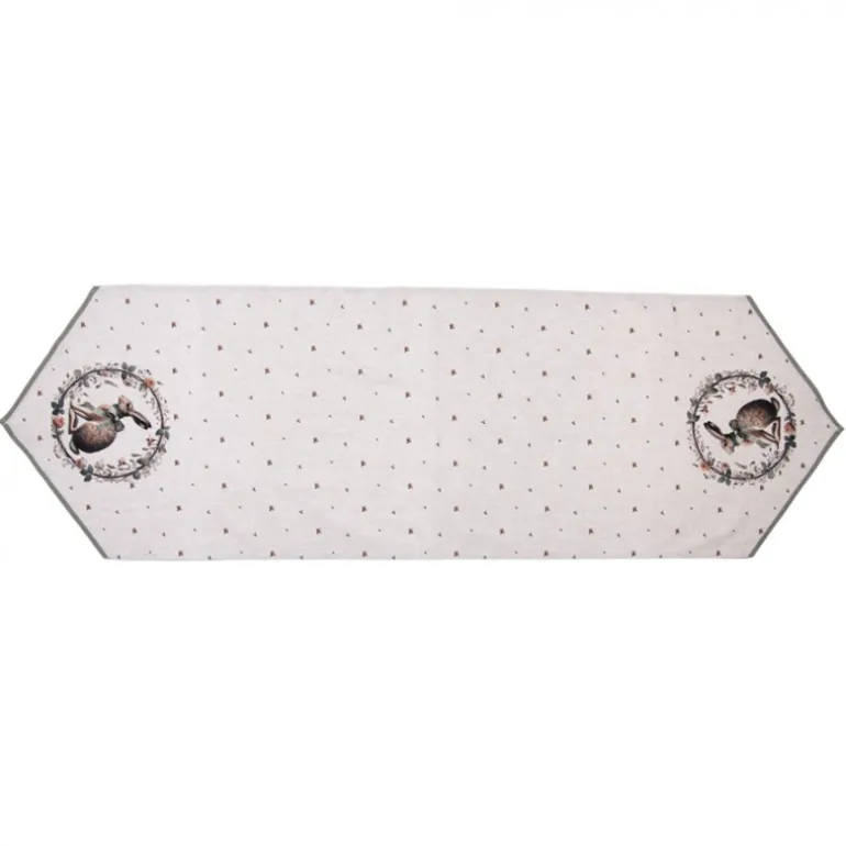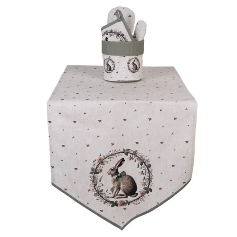 De textielserie is gemaakt van katoenen stof met eenbeige ondergrond en een design van een mooie krans met daarin een haas met een groene strik. De krans heeft allemaal bloemetjes, roosjes en blaadjes. Verspreid over de stof vind je ook kleine roosjes en blaadjes. De meeste items van deze serie zijn afgewerkt met een groene band.