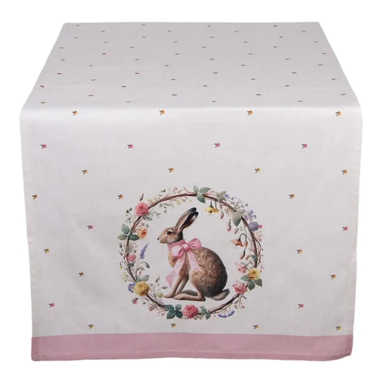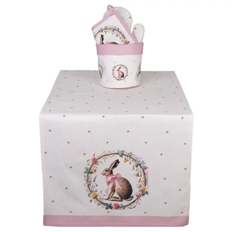 De textielserie is gemaakt van katoenen stof met eenbeige ondergrond en een design van een mooie krans met daarin een haas met een rozestrik. De krans heeft allemaal bloemetjes, roosjes en blaadjes. Verspreid over de stof vind je ook kleine roosjes en blaadjes. De meeste items van deze serie zijn afgewerkt met een rozeband.