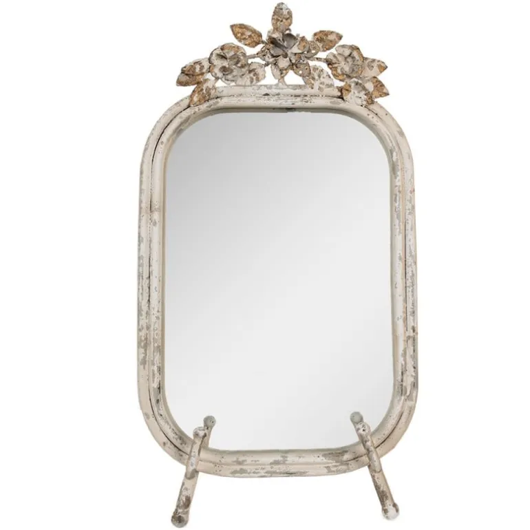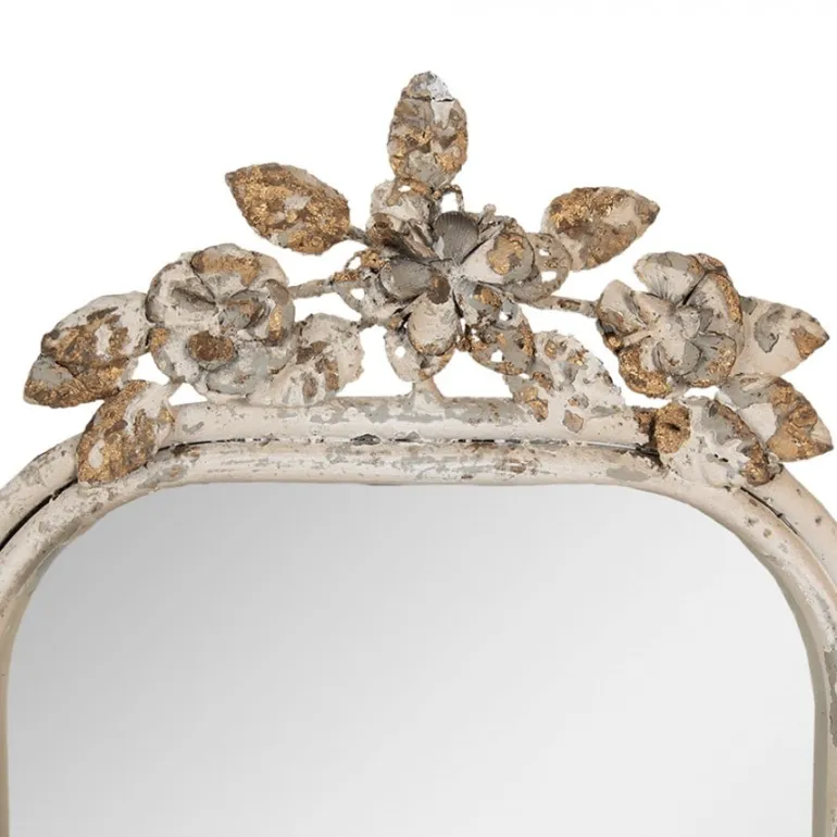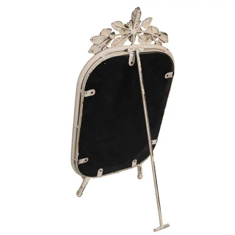 Hele mooie staande ijzeren spiegeldie je gemakkelijk overal neer kunt zetten! De spiegel is beige met goudkleur en heeft een brocante uitstraling. Aan de bovenkant zitten mooie bloemen!