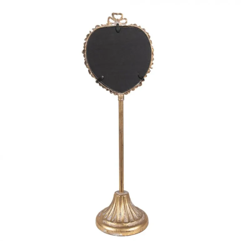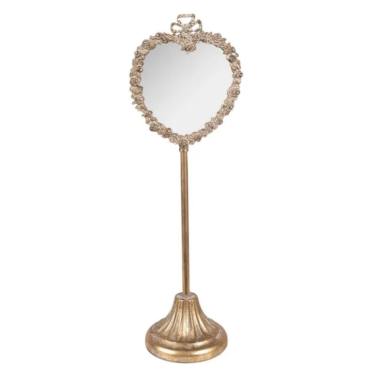 Prachtige staande tafelspiegel met de spiegel in hartvorm voorzien van kleine roosjes met daarin een glassteentjes en aan de bovenzijde een strik.