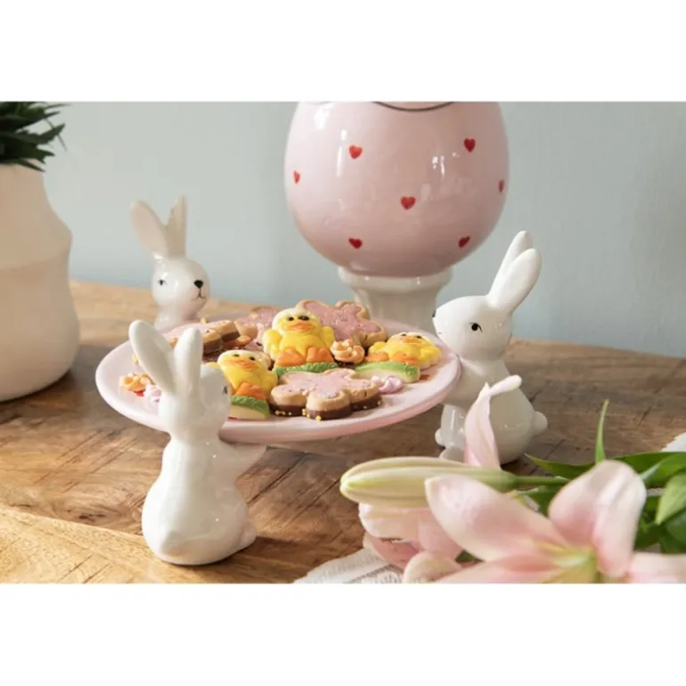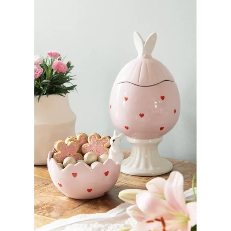 Mooie schattige voorraadpot in de vorm van een ei op voet. De deksel en ei zijn geschulpt alsof het ei door de helft is gedaan. De deksel heeft witte konijnen oortjes en de roze pot heeft rode hartjes.